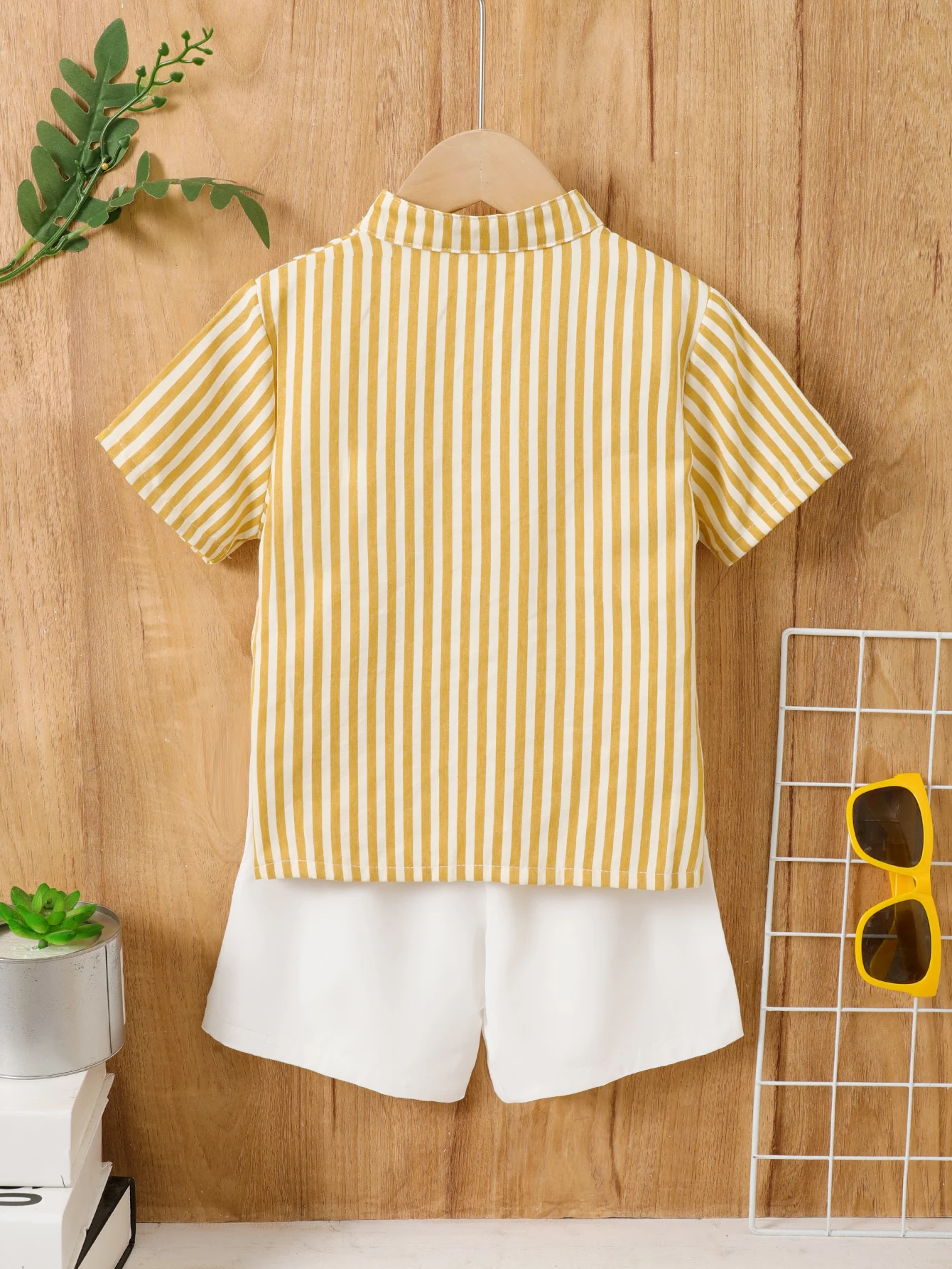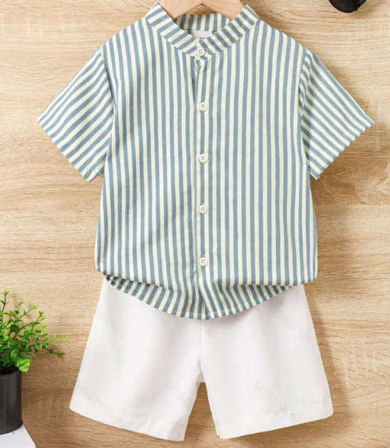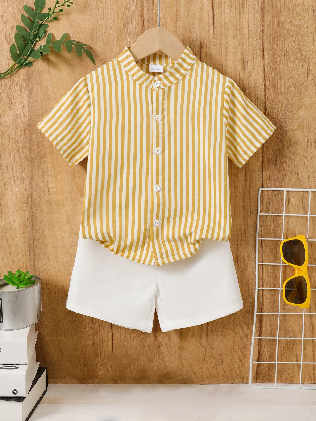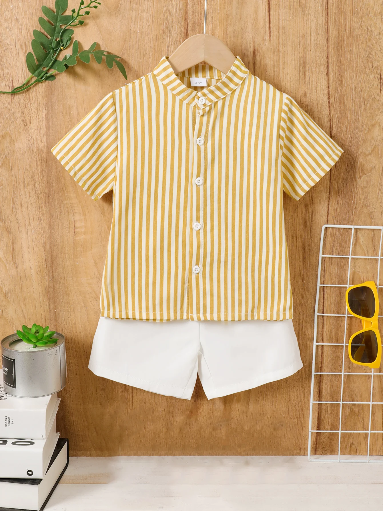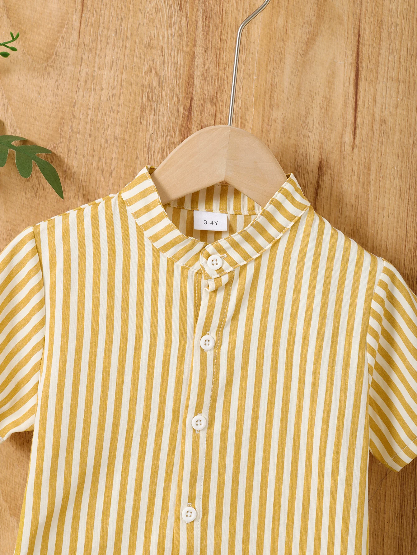 Young Boy Striped Stand Collar Short Sleeve Shirt And Shorts Set